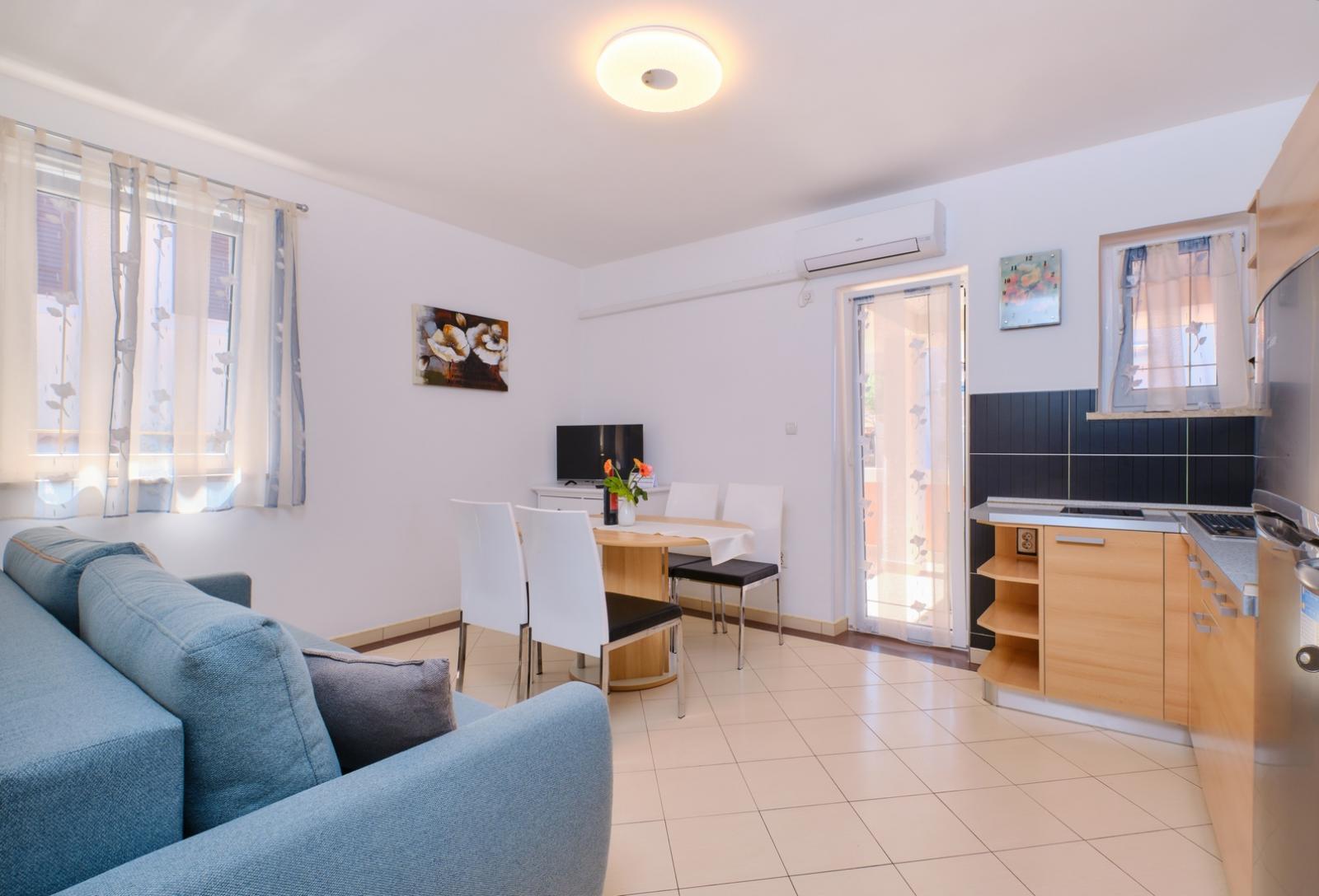 Die Ferienwohnung Orangina 1 liegt im ruhigen Viertel Zagazinjine, nur 100 Meter vom Meer und den beliebten Stränden Zagazinjine, Sv. Martin und Bojčić entfernt. Die Ferienwohnung befindet sich im ersten Stock und eignet sich ideal für drei Personen. Das gemütliche Wohnzimmer mit Schlafsofa ist mit einer modernen Küche verbunden, die Kühlschrank, Herd, Mikrowelle und Kaffeemaschine umfasst. Vom Wohnzimmer aus gelangt man auf einen Balkon mit wunderschönem Meerblick. Das Badezimmer verfügt über eine Dusche und alle wichtigen Annehmlichkeiten. Der berühmte Apoxyomenos-Museum befindet sich an der Uferpromenade im Zentrum von Mali Lošinj und ist leicht erreichbar. Die Umgebung ist ideal zum Wandern und Radfahren. Fahrräder und Motorroller können bequem in der Agentur Mediteran gemietet werden, um die Insel zu erkunden.
