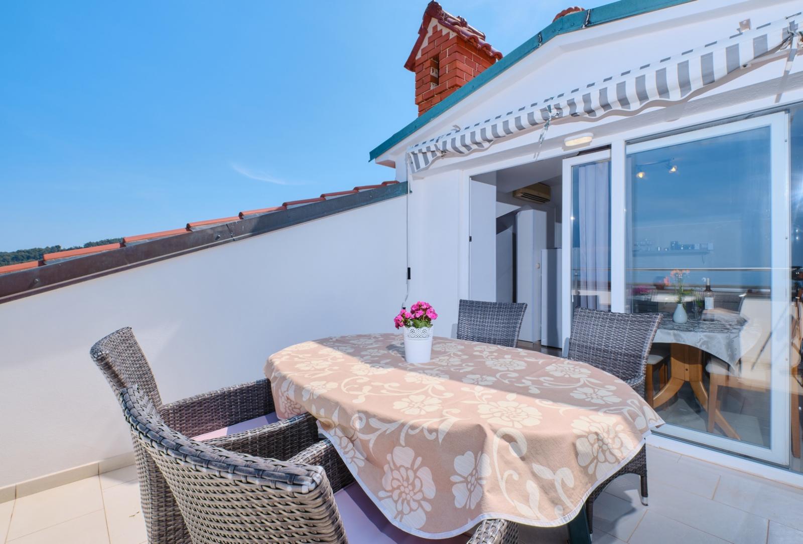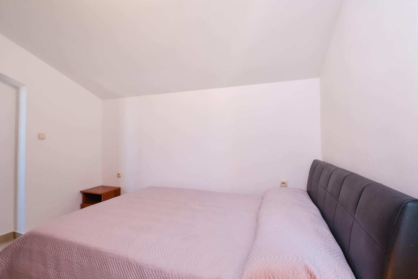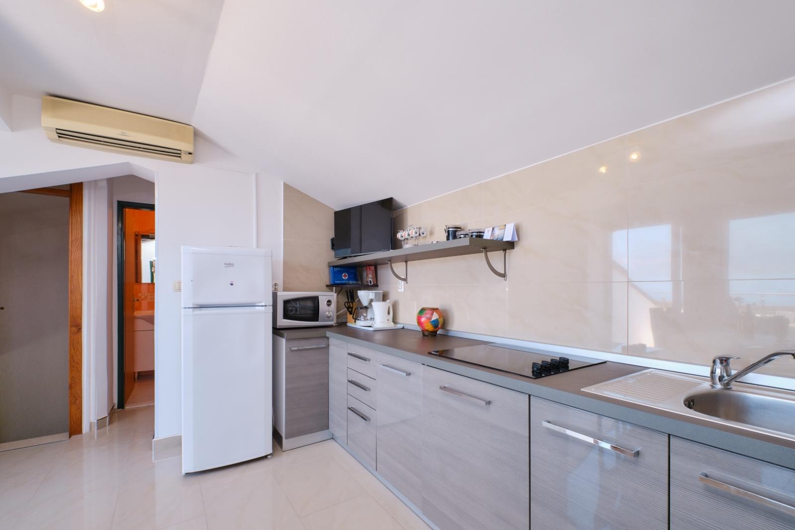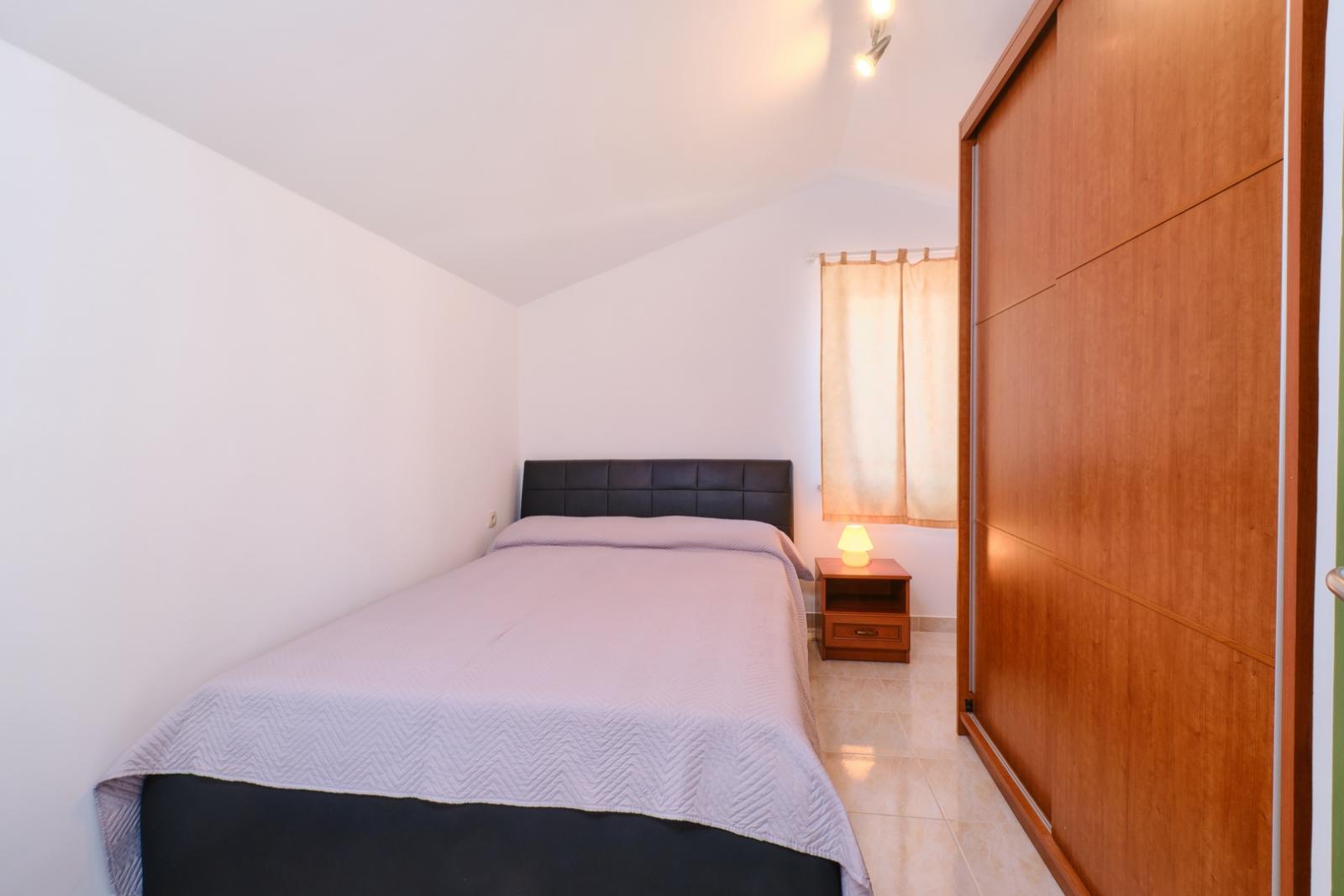 Die Ferienwohnung Orangina 4 befindet sich in einem ruhigen Teil von Mali Lošinj, nur 100 Meter vom Meer und dem beliebten Strand Sv. Martin entfernt, der für sein kristallklares Wasser und natürliche Felsbuchten bekannt ist. Die Wohnung im dritten Stock bietet Platz für 3–4 Personen und umfasst zwei Schlafzimmer mit Doppelbetten, eine voll ausgestattete Küche mit Kühlschrank, Herd, Mikrowelle und Kaffeemaschine sowie ein gemütliches Wohnzimmer. Das moderne Badezimmer bietet zusätzlichen Komfort. Der private Balkon mit Meerblick ist ideal, um morgens Kaffee zu genießen oder abends den Sonnenuntergang zu betrachten. Das Stadtzentrum liegt lediglich 800 Meter entfernt, wo sich auch das berühmte Museum des Apoxyomenos an der Uferpromenade befindet – ein kulturelles Highlight der Region. In der Umgebung gibt es zahlreiche Rad- und Wanderwege sowie Möglichkeiten für Wassersport. Fahrräder und Motorroller können bequem bei der Agentur Mediteran gemietet werden, um die Insel flexibel zu erkunden.