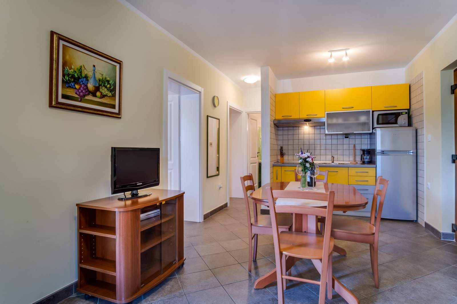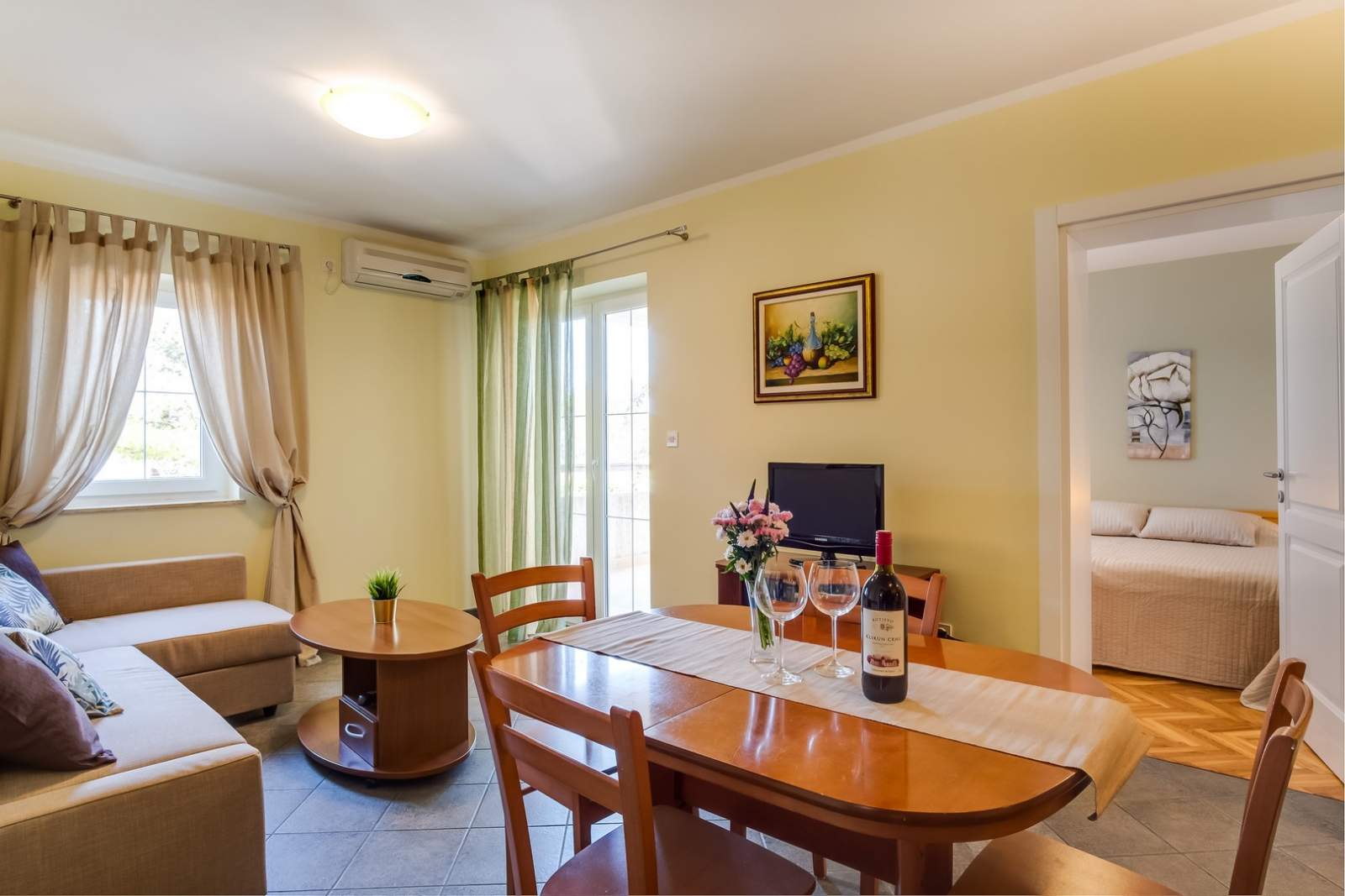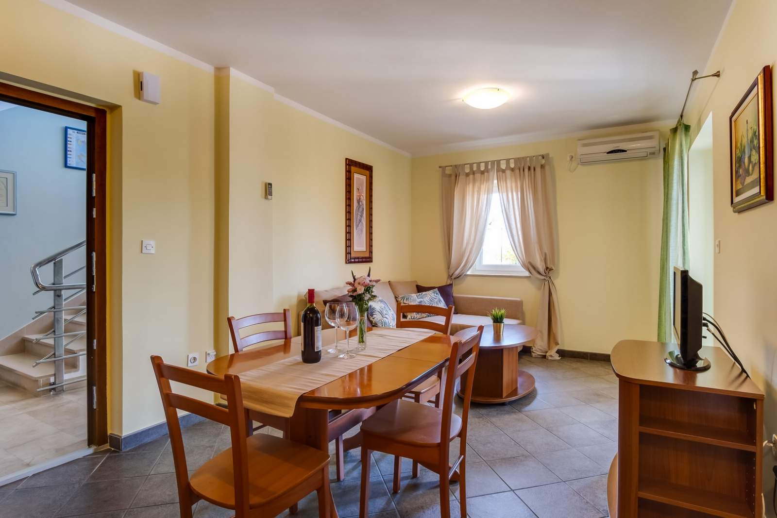 Apartman ima zastarjeli namještaj u dnevnoj sobi.