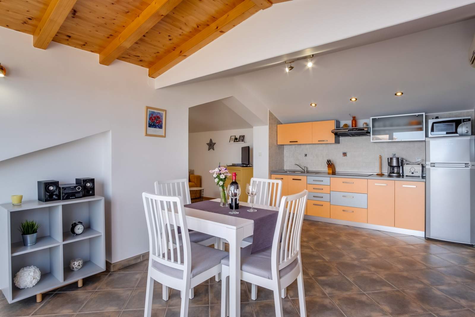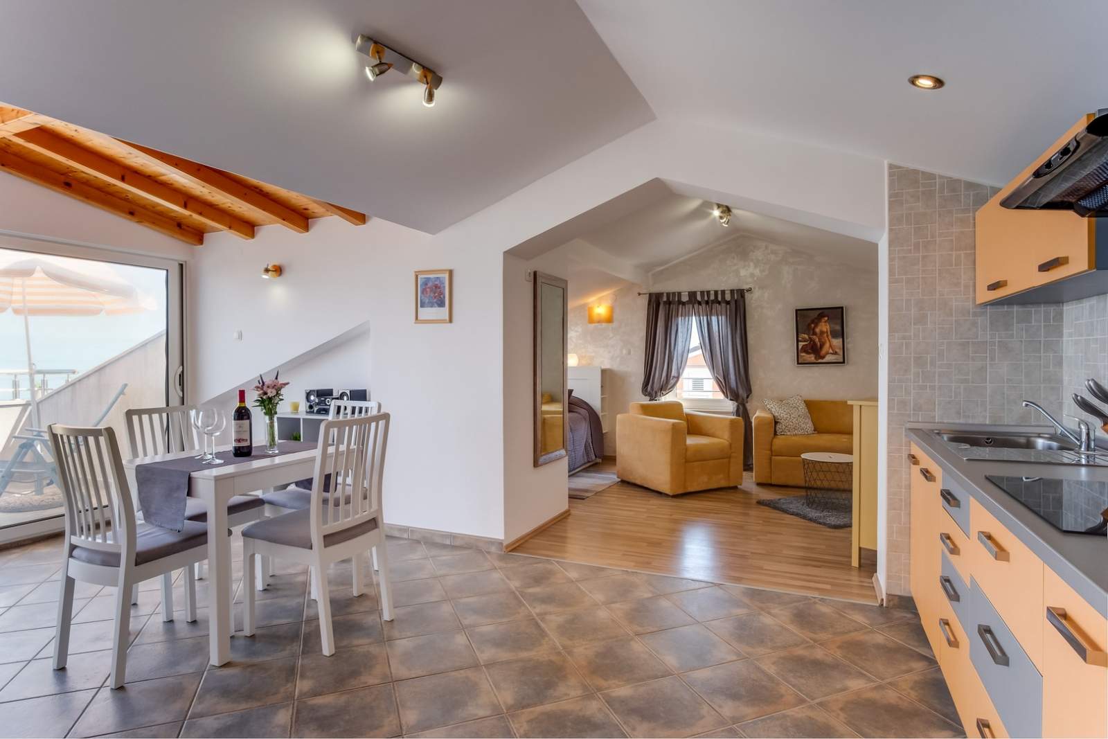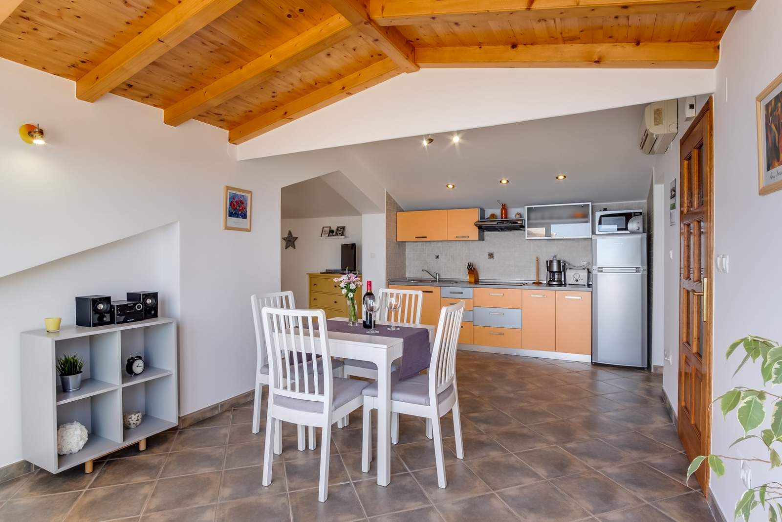 Apartment Branka 4 is located on the third floor of a family house, just 100 m from the sea and close to the charming Sveti Martin harbor. Ideal for 2 guests, it features a bedroom with a double bed, a modern kitchen equipped with a stove, refrigerator, microwave and coffee maker, a dining area and a living room with TV and free WiFi. The bathroom includes a shower and essential toiletries. A spacious balcony offers a beautiful sea view. Nearby beaches include Bojčić, Zagazinjine and Valdarke. The center of Mali Lošinj, home to the famous Museum of Apoxyomenos, is within easy walking distance. Bikes and scooters can be rented through the Mediteran agency: rent a bike | rent a scooter.