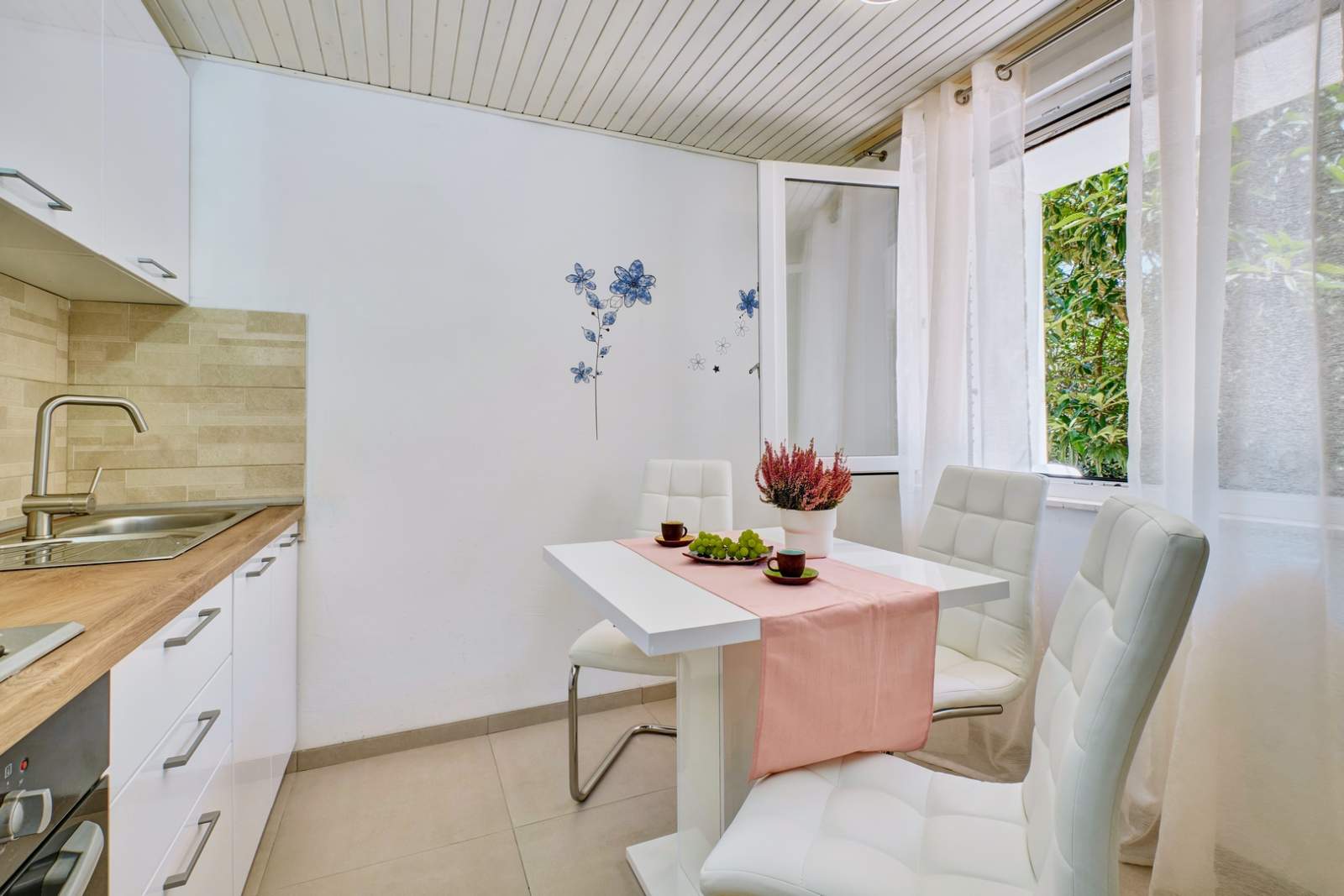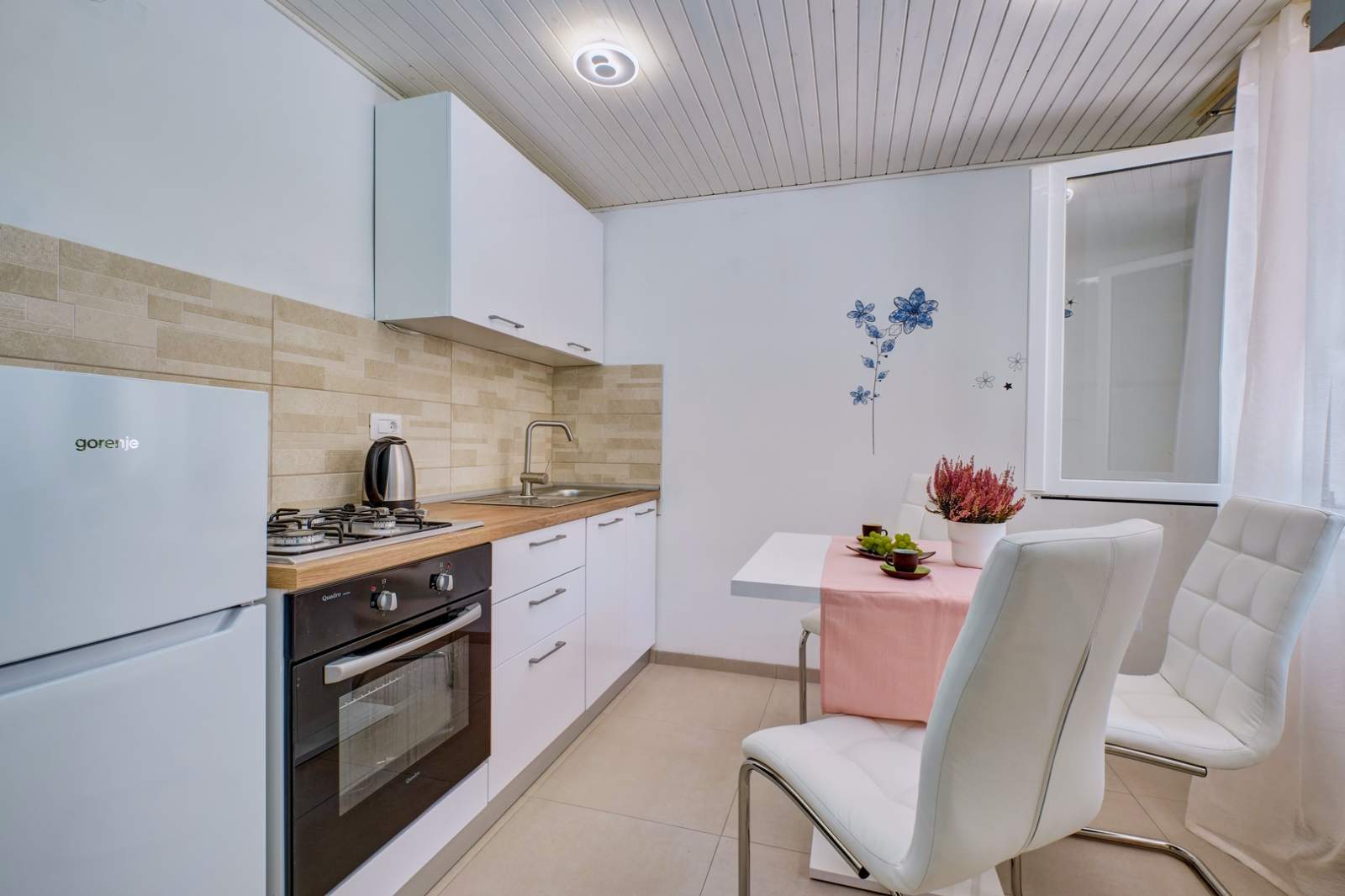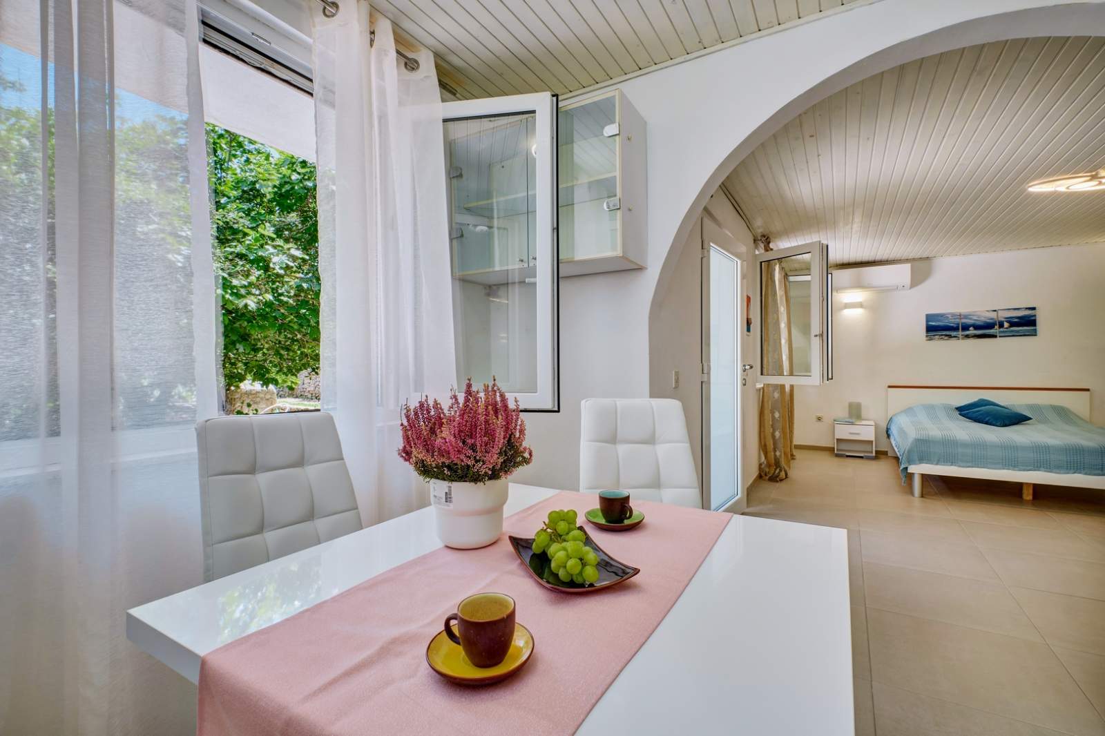 Studio Apartment Deja 3 is located on the ground floor and is ideal for two people. The interior is modern and functional, featuring a comfortable double bed, a small dining area, and a fully equipped kitchen. The kitchen includes a refrigerator, stove, oven, and kettle. The bathroom is modernly designed and equipped with a shower and washing machine. The apartment offers free Wi-Fi and air conditioning, ensuring a pleasant and carefree stay.