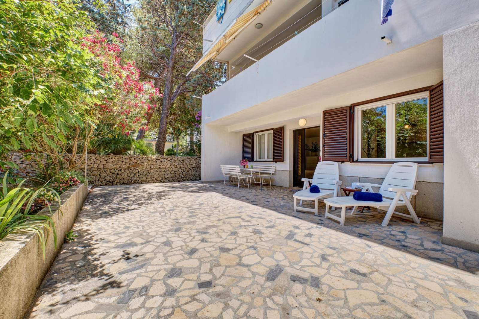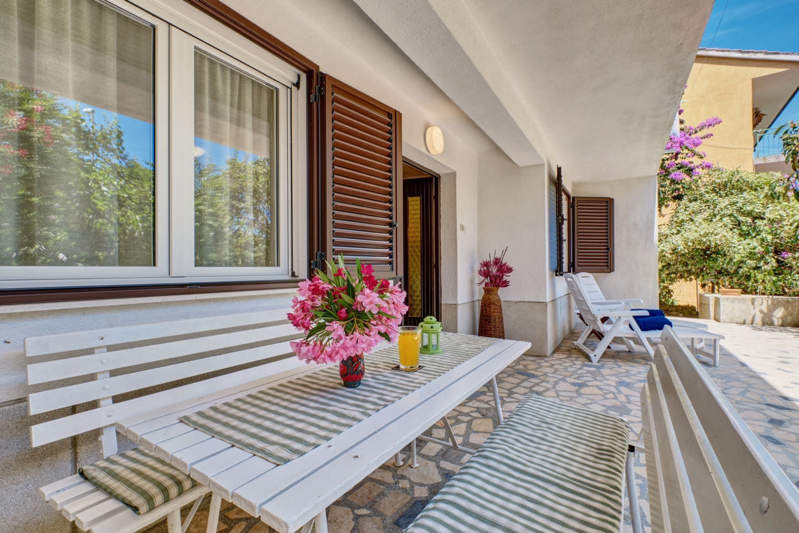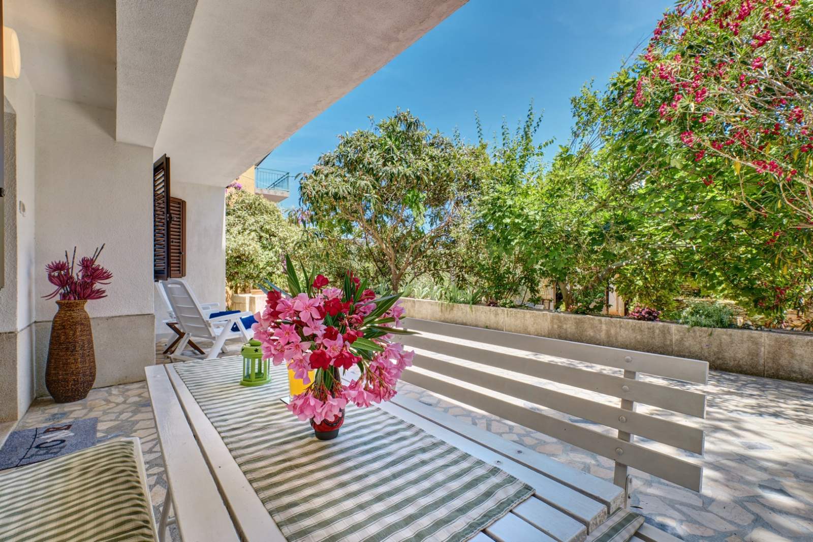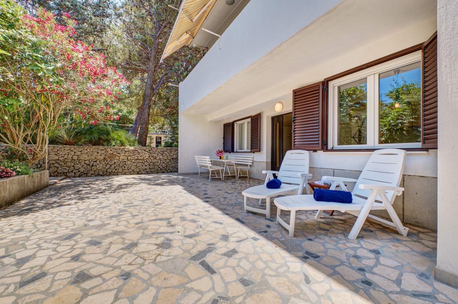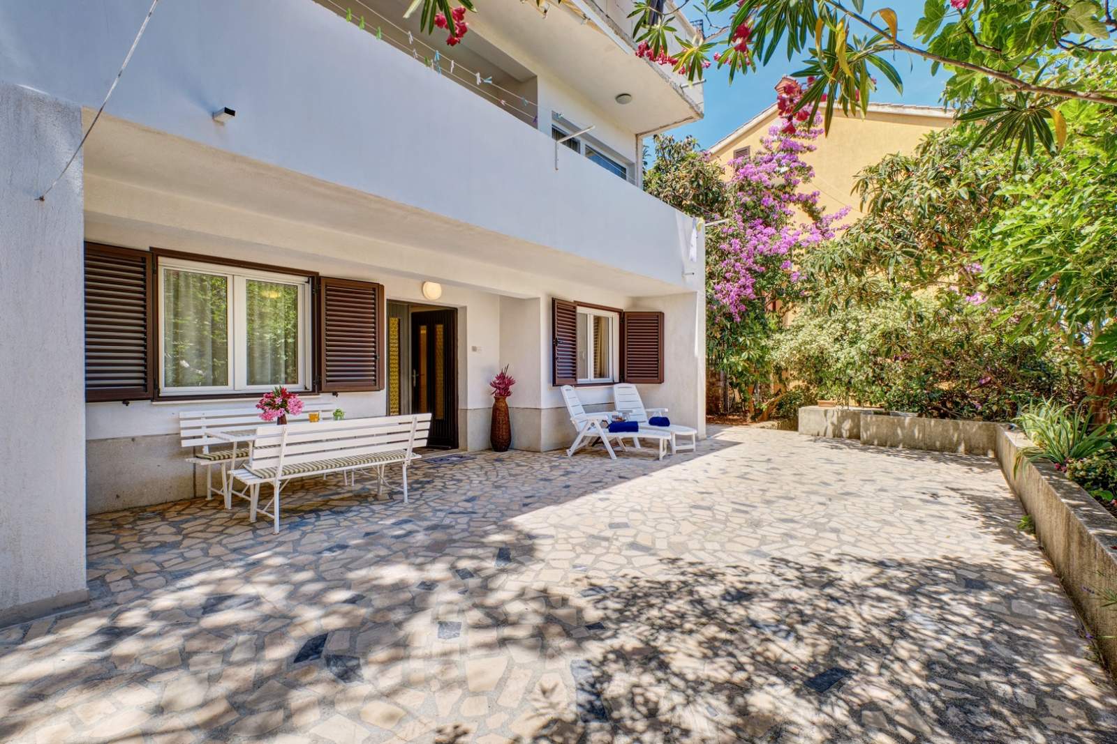 The apartment has a private terrace with comfortable outdoor furniture, perfect for enjoying morning coffee or evening meals. It is located close to Čikat, known for its walking trails, beaches, and natural beauty. Parking is available on-site, making the stay even more convenient for guests.