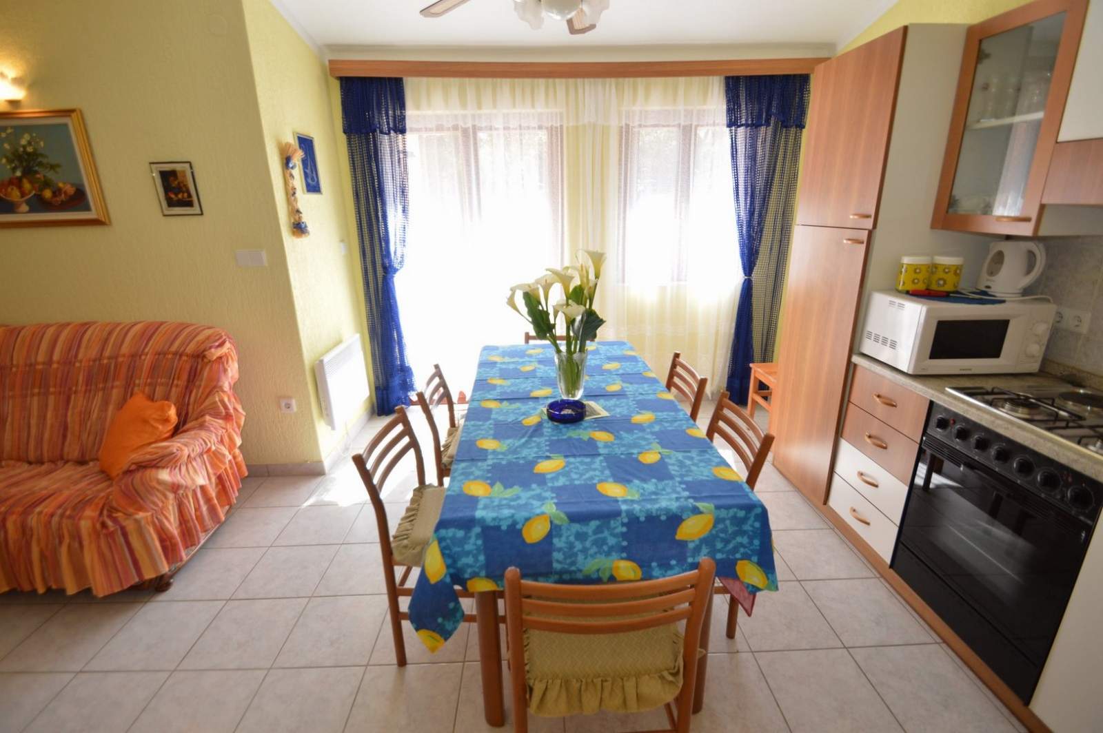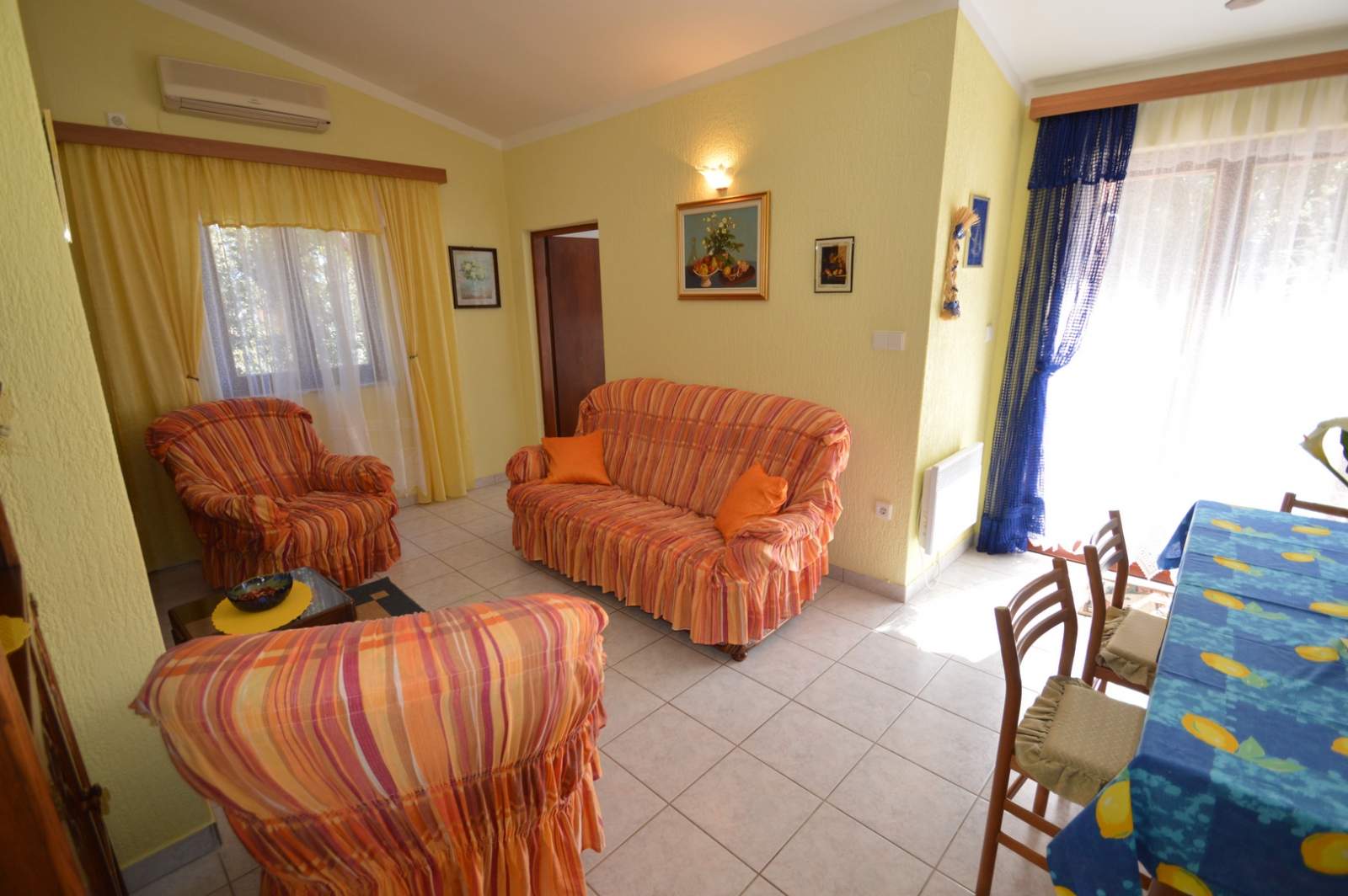 Apartment Franka 1 offers 84 m² of modern, spacious accommodation ideal for up to 4 guests. It features two comfortable bedrooms with high-quality bedding, a large living room with sofa and TV, and a fully equipped kitchen including an oven, microwave, refrigerator, coffee maker and dishwasher. The bathroom includes a bathtub for relaxing moments, while air conditioning and free WiFi enhance comfort. A large terrace overlooking the greenery is perfect for outdoor dining or morning coffee, and private parking ensures convenience. Located in a quiet street in Artatore, the apartment is just a short walk from beautiful beaches such as Artatore and Luka, known for their crystal-clear sea. A short drive away is Mali Lošinj, home to the famous Museum of Apoxyomenos. The area is ideal for walking and cycling. Bike and scooter rentals are available through the Mediteran agency: rent a bike and rent a scooter.