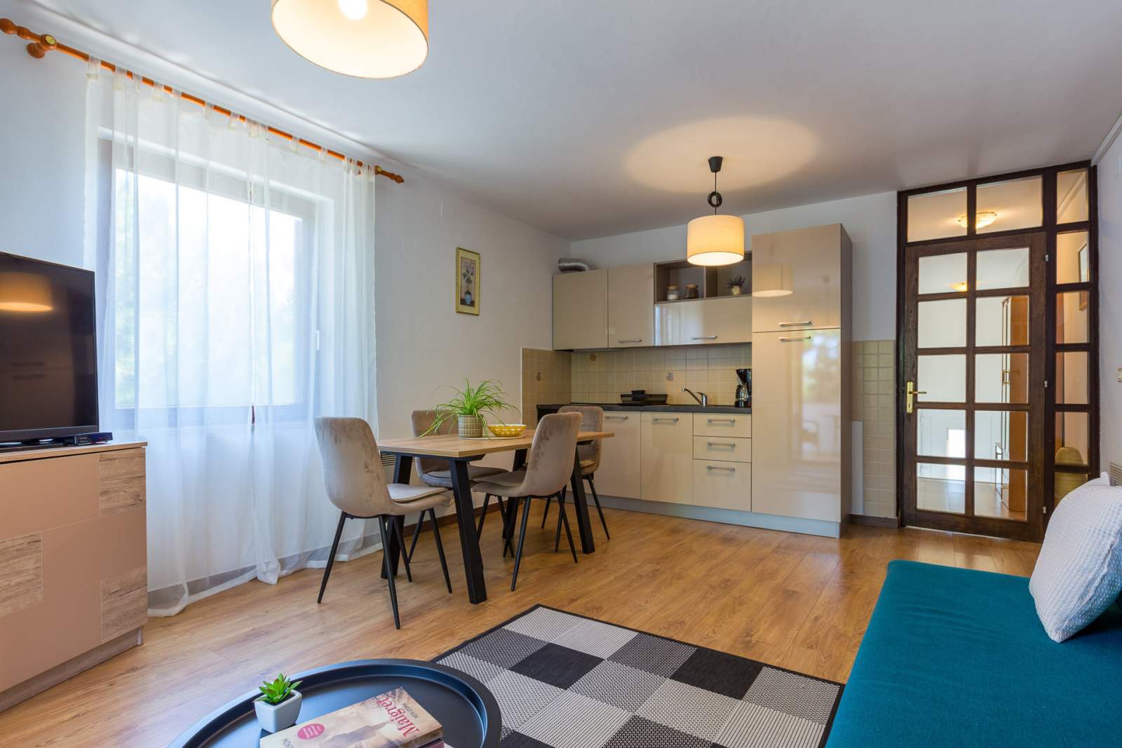 Apartment Kristina 1 is located in a peaceful area of Mali Lošinj, just 150 meters from the sea and close to the beaches of Bojčić, Zagazinjine and Valdarke, known for their crystal-clear water and relaxing atmosphere. The apartment accommodates up to three guests and includes a bedroom with a double bed, a spacious living room with a sofa bed, and a dining area connected to a fully equipped kitchen featuring a stove, refrigerator and microwave. The bathroom offers a shower, washing machine and essential toiletries. A terrace with views of the sea and forest provides the perfect spot to unwind, while private parking ensures convenience. The town center, located about 500 meters away, is home to the Museum of Apoxyomenos on the waterfront, one of the island’s most significant cultural attractions. Guests can enjoy walking and cycling trails throughout the area, and bicycles and scooters can be rented at the Mediteran agency for easy island exploration.