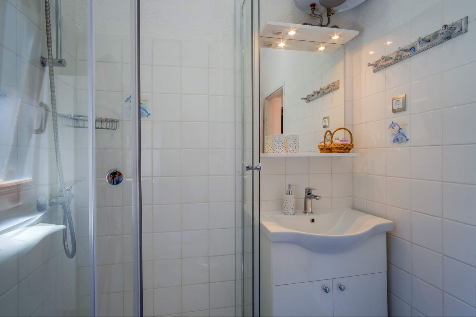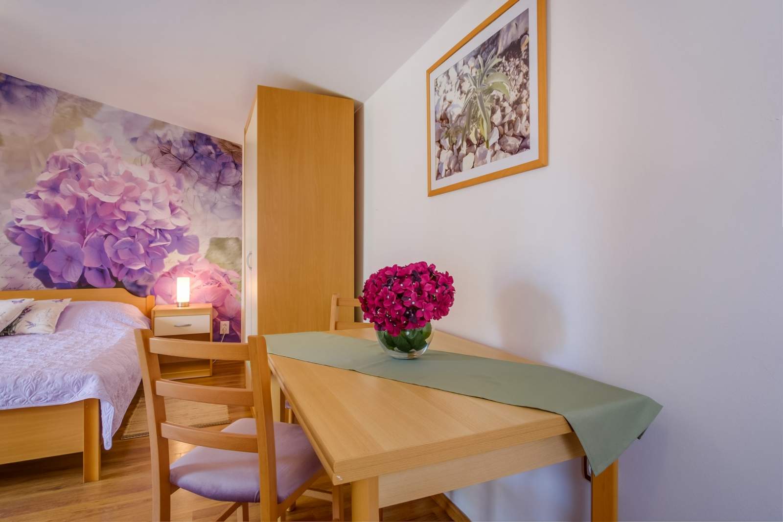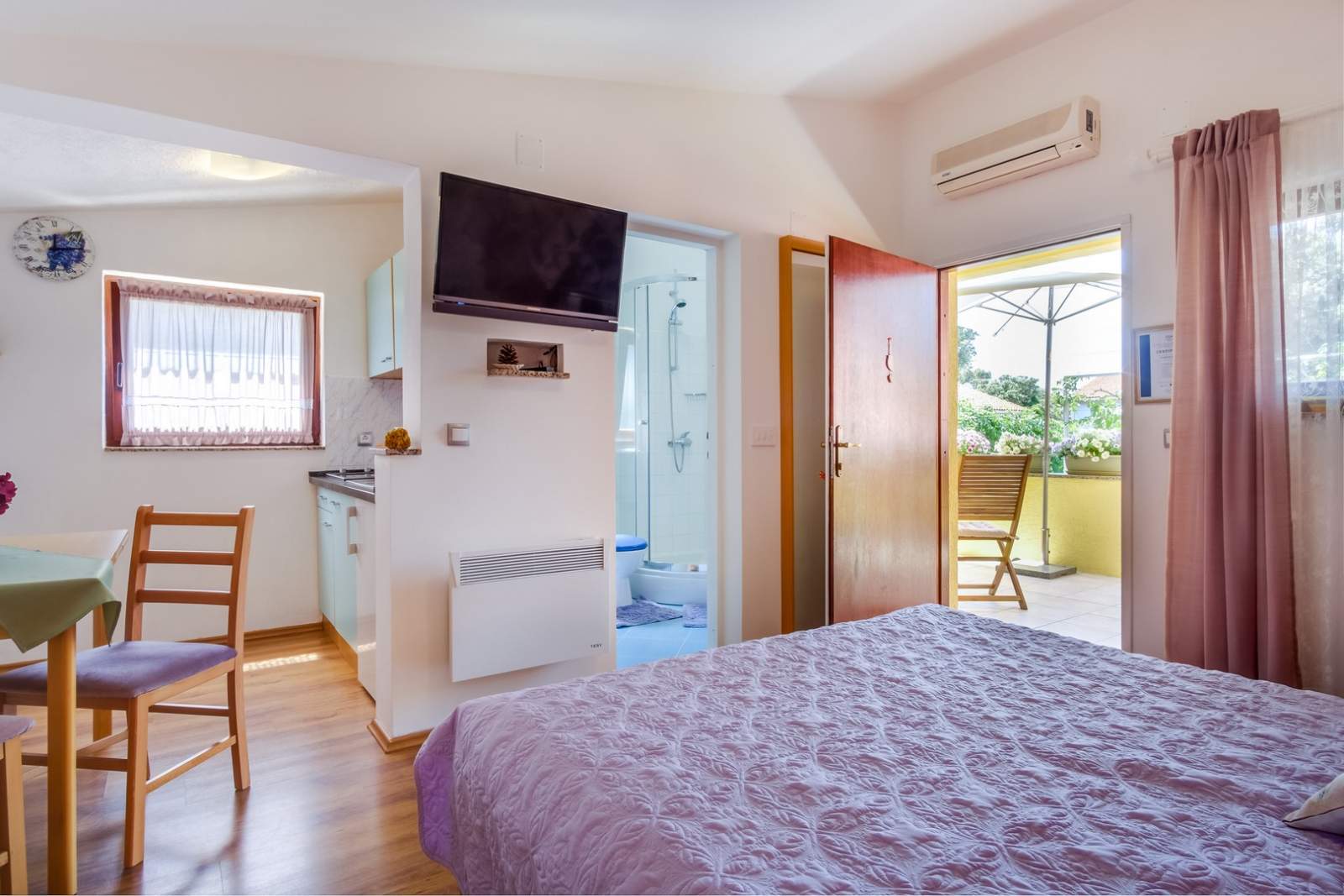 Apartman Arty 1 smješten je u Artatorama, samo 150 metara od mora, te nudi ugodan i funkcionalan prostor idealan za parove. Nalazi se u prizemlju i sastoji se od bračnog kreveta, moderne kupaonice s tušem, blagovaonice te potpuno opremljene kuhinje s hladnjakom, štednjakom, aparatom za kavu i ostalim osnovnim aparatima. Jednostavan, ali vrlo praktičan dizajn pruža sve što je potrebno za bezbrižan boravak. Iz apartmana se izlazi na šarmantnu terasu okruženu zelenilom – savršeno mjesto za jutarnju kavu ili večernje opuštanje nakon dana na plaži. U neposrednoj blizini nalaze se prekrasne plaže s kristalno čistim morem, kao što su Artatore Beach, Sunčana uvala i Zagazinjine. Kratkom vožnjom dolazi se do Malog Lošinja, gdje je smješten poznati Muzej Apoksiomena, nezaobilazna kulturna atrakcija. Okolica je idealna za biciklizam i šetnje, a u agenciji Mediteran moguće je unajmiti bicikle i skutere za dodatno istraživanje otoka: rent a bike i rent a scooter.