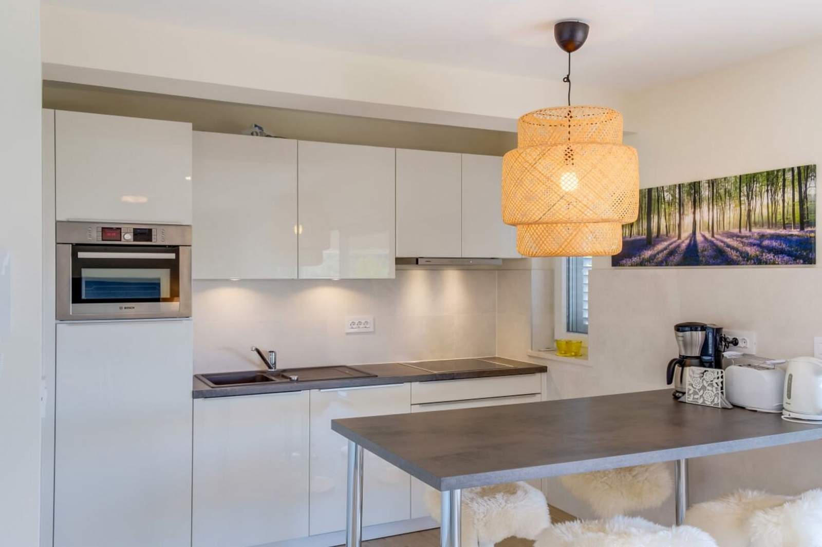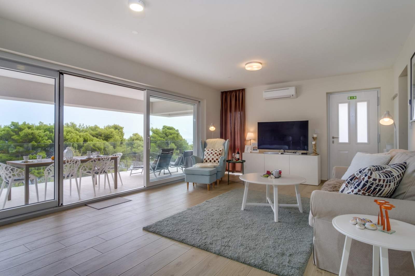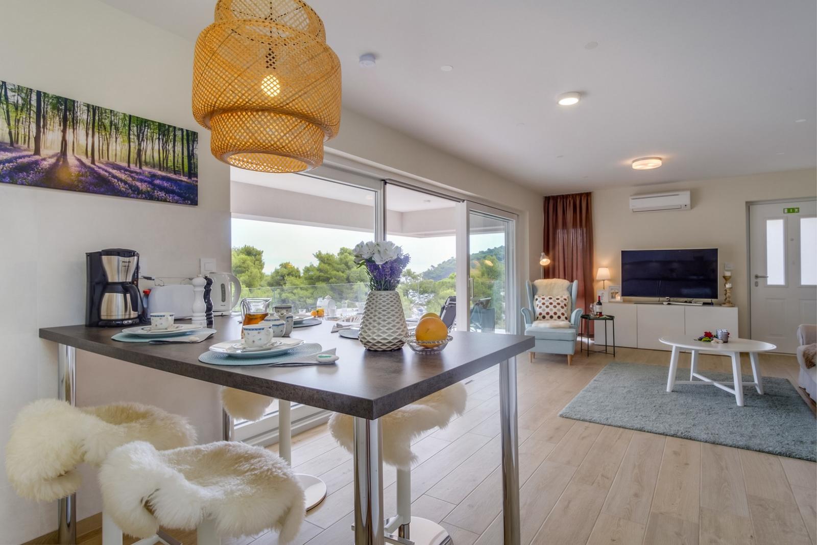 D&B Sea View Villas predstavlja luksuzni smještaj uz samu obalu u Malom Lošinju, idealan za goste koji traže spoj modernog dizajna, privatnosti i neposredne blizine mora. Prostrani apartman površine 97 m² uređen je elegantno i suvremeno, s dvije udobne spavaće sobe opremljene king-size krevetima, prozračnim dnevnim boravkom sa Smart TV-om, brzim Wi-Fi-jem i klimatizacijom te potpuno opremljenom kuhinjom s perilicom posuđa, mikrovalnom pećnicom i aparatom za kavu. Poseban doživljaj pruža privatna terasa s otvorenim pogledom na more, idealna za opuštanje uz zalazak sunca. Apartman se nalazi uz samu plažu, a u blizini su i poznate plaže Čikat, Kadin i Valdarke, savršene za kupanje i sunčanje. Centar Malog Lošinja udaljen je svega nekoliko minuta, gdje se u gradskoj luci nalazi Muzej Apoksiomena. U agenciji Mediteran moguće je iznajmiti bicikle i skutere putem Rent a Bike Lošinj i Rent a Scooter Lošinj, što omogućuje jednostavno istraživanje otoka.