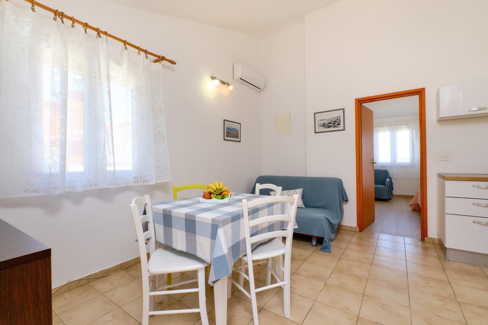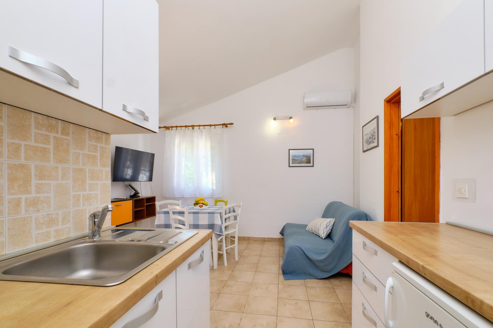 Apartma Gemma 1 se nahaja v mirnem predelu Malega Lošinja in je idealen za do tri osebe. Iz balkona se odpira čudovit razgled na morje in pristanišče, kar ustvarja prijetno vzdušje med bivanjem. Apartma vključuje spalnico z zakonsko posteljo, dnevni prostor z raztegljivim kavčem ter popolnoma opremljeno kuhinjo s hladilnikom, kuhalno ploščo in mikrovalovno pečico. Kopalnica je opremljena s tušem in osnovnimi pripomočki, gostom pa sta na voljo brezplačen Wi-Fi in klimatska naprava. Lokacija je odlična za obisk priljubljenih plaž, kot so Čikat, Sunčana uvala in Borik, ki slovijo po kristalno čisti vodi. V bližnjem središču Malega Lošinja se ob obali nahaja tudi znani Muzej Apoksiomena. Za raziskovanje otoka lahko v agenciji Mediteran najamete kolesa in skuterje ter preživite dan v naravi.