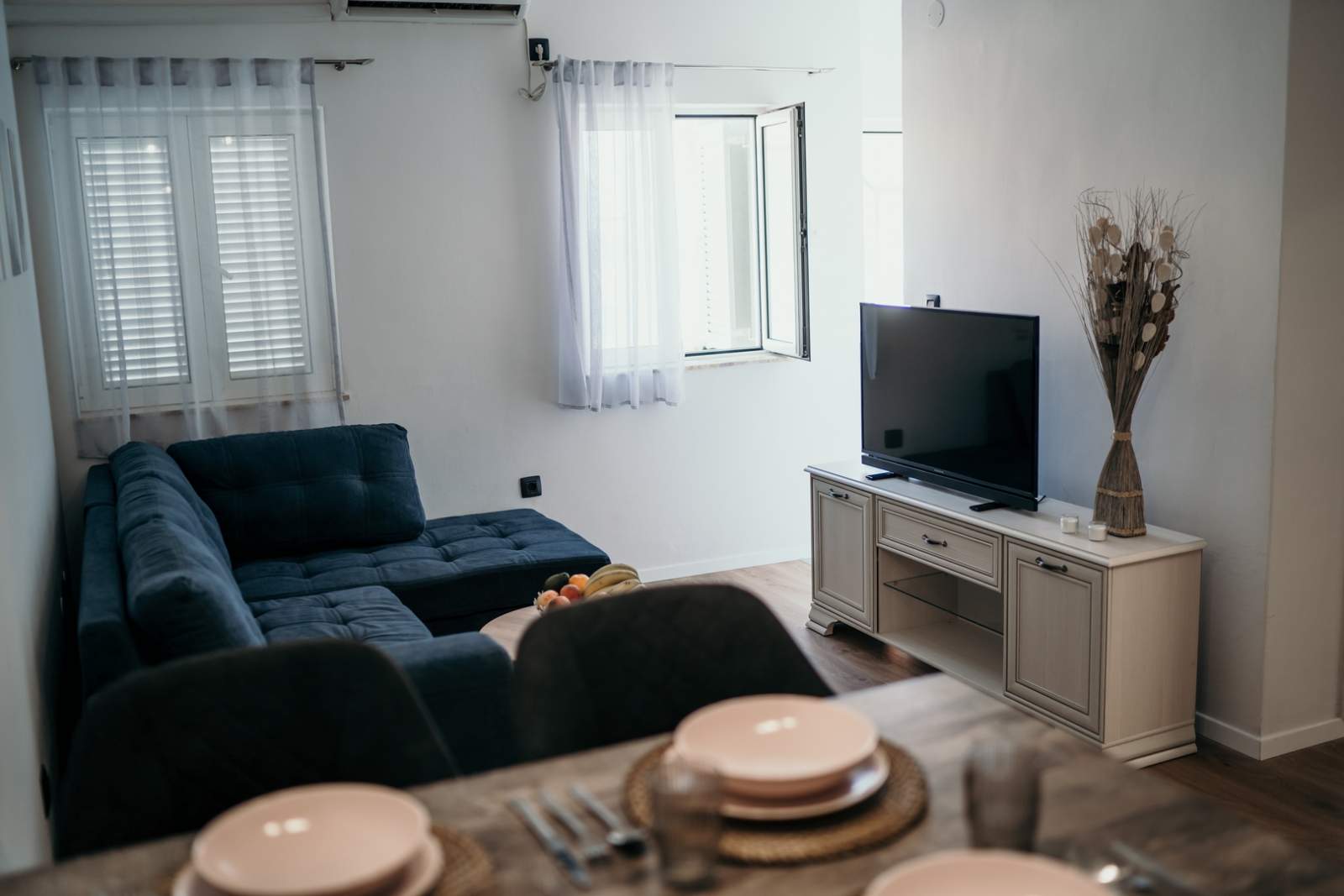 Apartma Kika 1 ponuja prostorno in udobno notranjost, ki popolnoma ustreza potrebam do štirih oseb. Ima dve elegantno opremljeni spalnici z udobnimi posteljami in kakovostno posteljnino, moderno kopalnico s tušem in osnovnimi toaletnimi potrebščinami. Dnevna soba je opremljena z udobnim kavčem, televizijo z ravnim zaslonom in brezplačnim Wi-Fi-jem za sprostitev in zabavo. Popolnoma opremljena kuhinja vključuje hladilnik, pečico, pomivalni stroj in grelnik vode, kar omogoča preprosto in prijetno pripravo obrokov. Prostor je skrbno oblikovan, da nudi občutek topline in domače udobnosti.