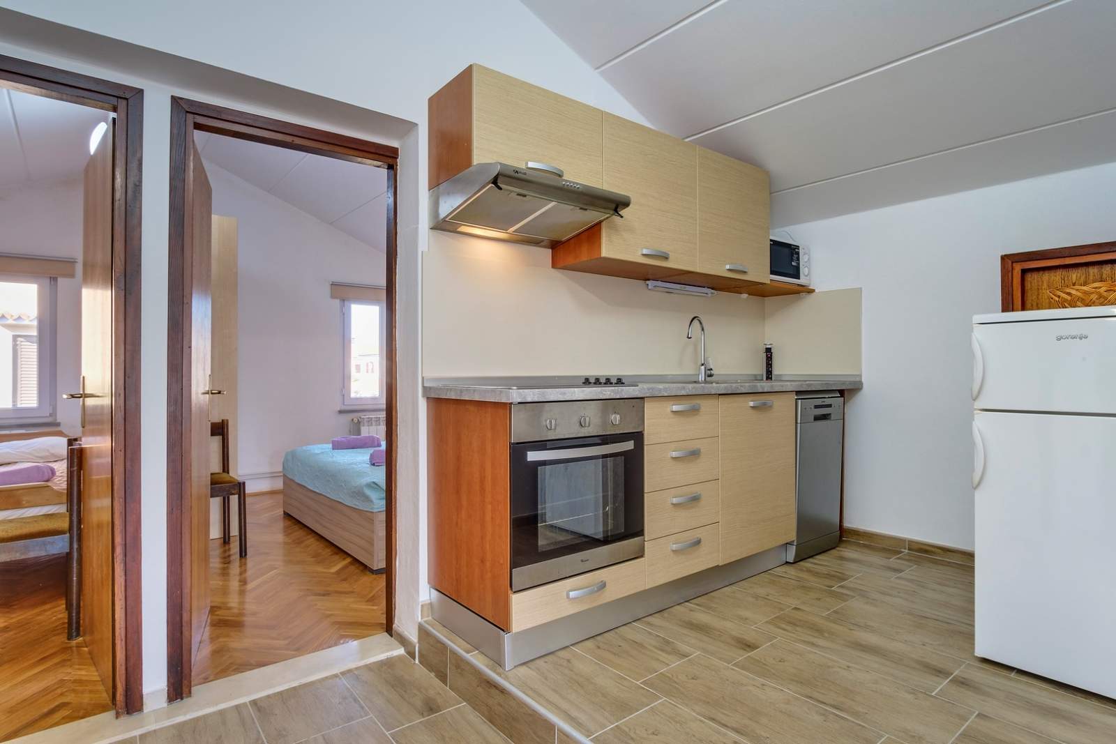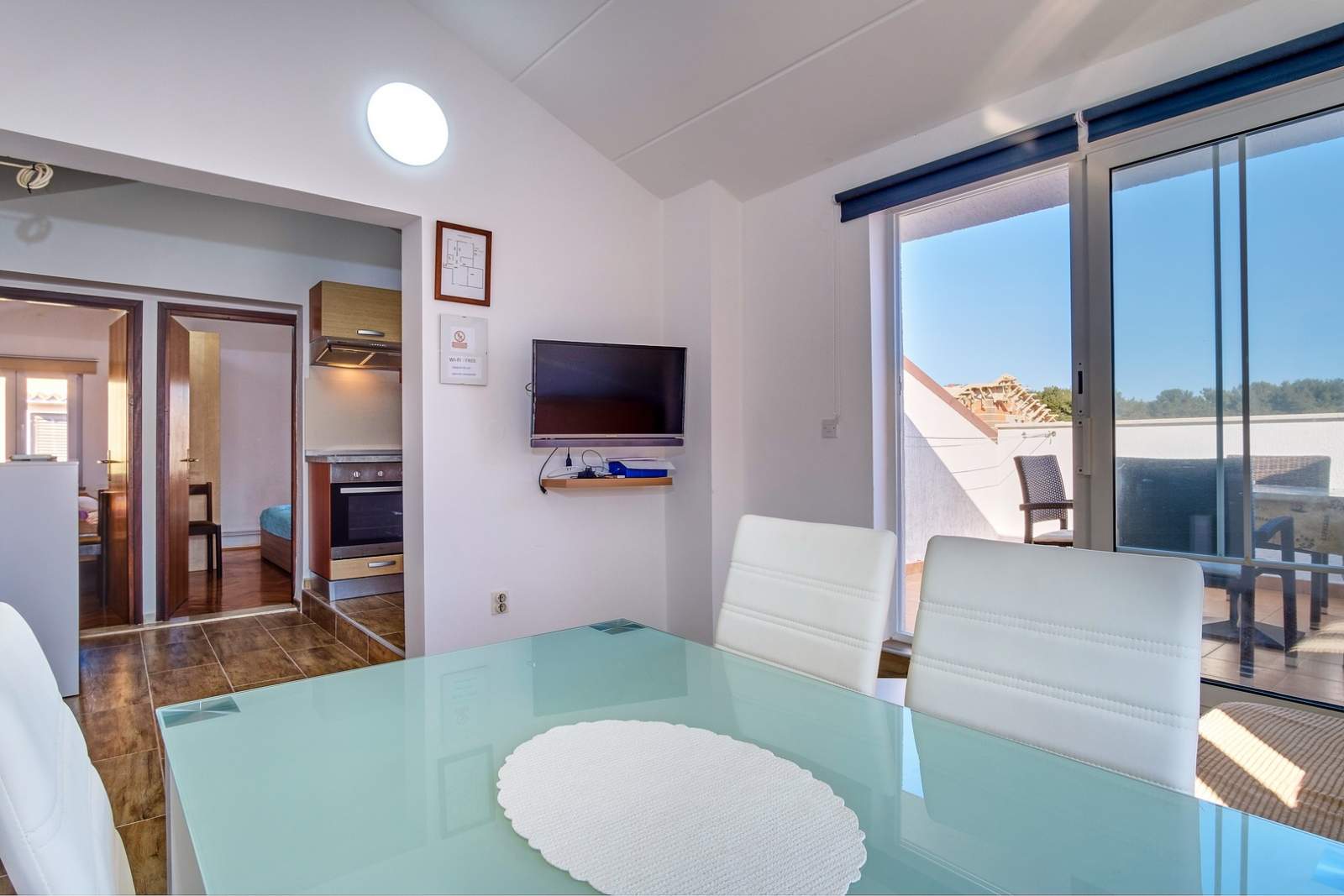 Apartma Marta 3 v Malem Lošinju ponuja sodoben in udoben prostor, primeren za družine ali skupine prijateljev. Sestavljajo ga dve prostorni spalnici ter svetla kuhinja z jedilnico, opremljena z indukcijsko ploščo, pečico, mikrovalovno pečico, hladilnikom in pomivalnim strojem. V dnevnem prostoru so gostom na voljo TV s satelitskimi programi, klimatska naprava in brezplačen WiFi. Terasa z delnim pogledom na morje je kot nalašč za sproščanje ali obrok na prostem, apartma pa je le 180 metrov oddaljen od kristalno čistega morja. V bližini se nahajajo plaži Zagazinjine in Čikat, znani po čudoviti naravi in čisti vodi. Muzej Apoksiomena ob mestni obali je ena najbolj priljubljenih kulturnih točk. Okolica ponuja restavracije, trgovine, kolesarske poti in številne aktivnosti na prostem. Za lažje raziskovanje otoka lahko v agenciji Mediteran najamete kolesa ali skuterje – informacije najdete prek rent a bike in rent a scooter.